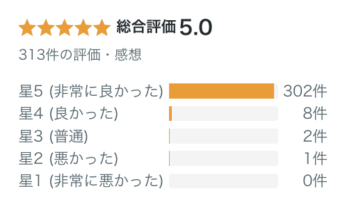 - お客様からの口コミ評価は、300件以上が☆5.0の満点評価